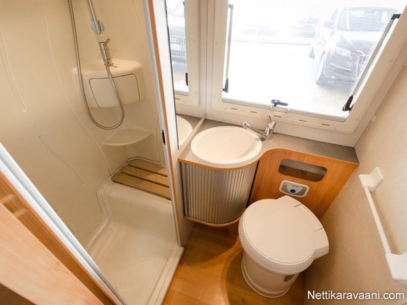 No tuossa itsellä on Rellussa WC + suihku, molemmat omina tiloinaan, suihkuseinällä/-ovella erotettuna. Ja valmiita petejä on 4 kpl, joista 2 kpl alkovissa. Keskiosan pöytäryhmästä saa sitten tarvittaessa vielä 2 kpl petipaikkoja lisää, mutta kuka jaksaa noiden kanssa joka ilta & aamu jumpata jos ei pakko ole. Tosin tuolla autolla on pituutta "jopa" 6,59m, vaikkakin B-kortti kuskille riittää