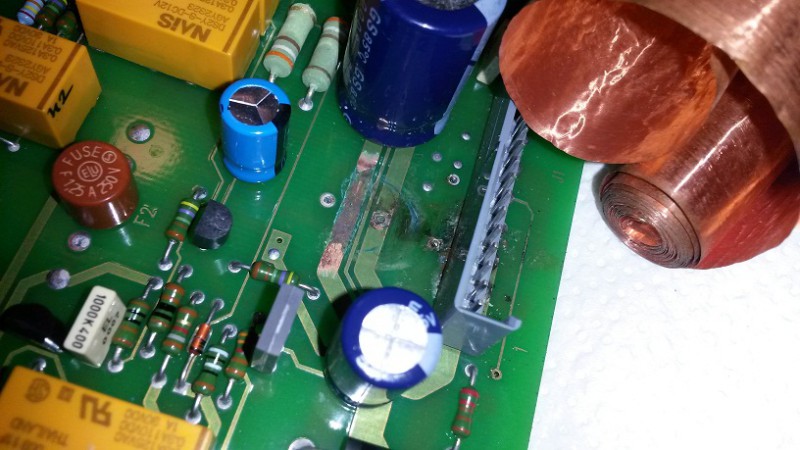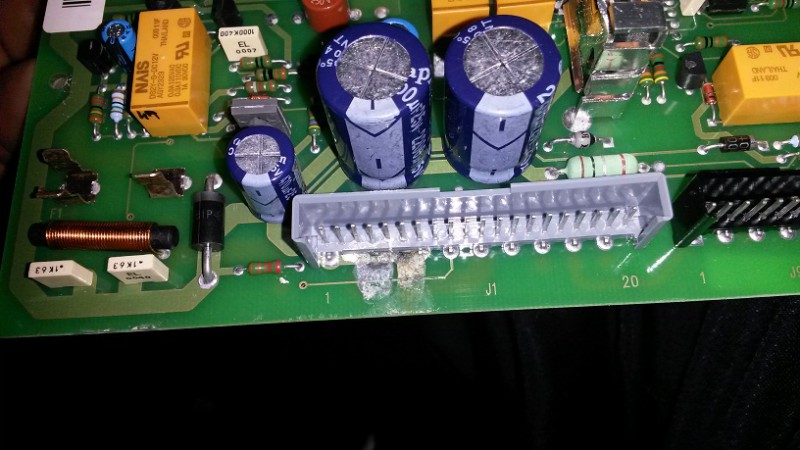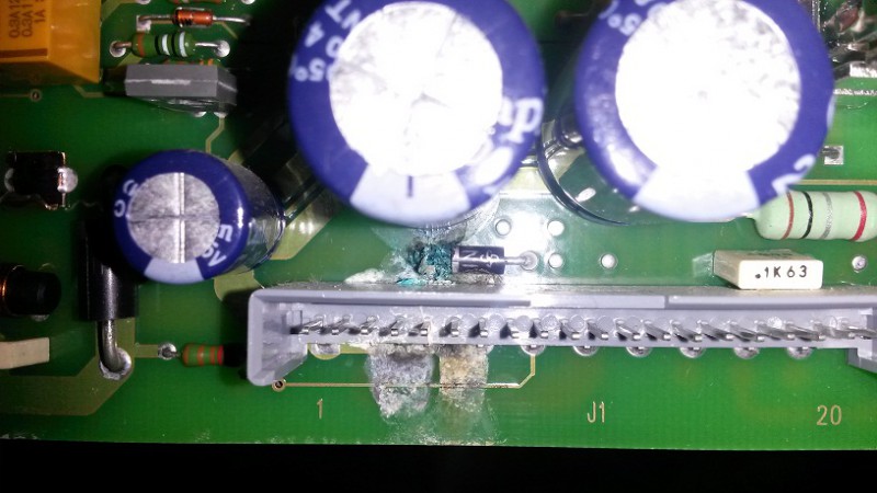 Piirilevyllä havaitut viat olivat seuraavat: riviliittimen(harmaa) yläpuolella oleva konkka(2200uF/25v) oli vuotanu ja konkan alapuolella oleva diodi (1n4007) oli hapettunu. vaihdoin osat vastaaviin ja korjasin piirilevyn hyppylangalla, konkan alta oli syöpyny kupari pois.  lasiputki sulaketta ei ollu laisinkaan paikoillaan koska sulakkeen jalat oli rikki.  Mistähän lähtisin etsimään vikaa.   piirikortin numero on: 3400005200017400201 212000   Jos löytyy ehjä kortti kohtuu hintaan, olen kiinnostunu ostaan sellaisen