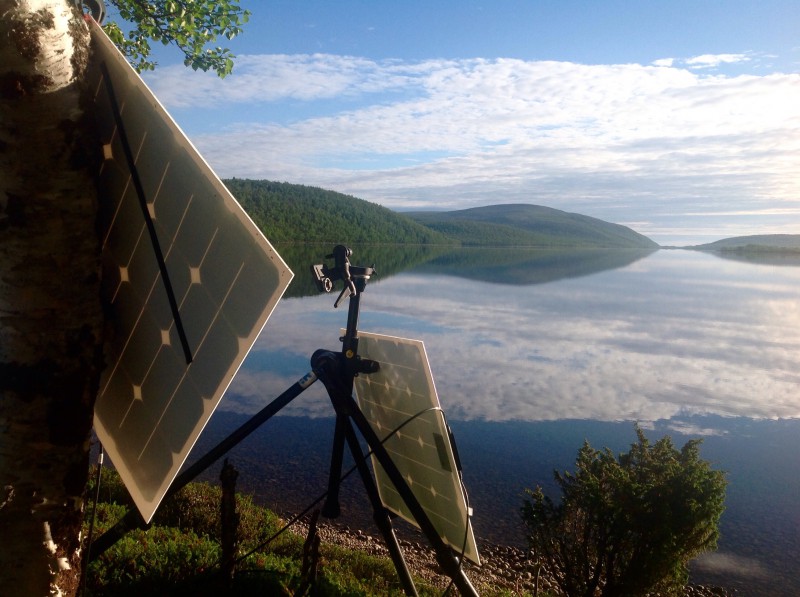 No nyt ollaan tositoimissa. Pari viikkoa pitäisi näillä eväillä mennä. Ollaan napapiirin yläpuolella 400km, ja aamu viideltä sain imuroitua 4A hetkittäin ,seiskan maissa 5A, ikävä järvenpinta avittaa varsinkin kun aurinko on matalalla. Varmaan ainoa päivä tässä reisussa, kun pitää lisätä kulutusta, ettei mene hukkaan. Niin tuo kuvan vehe on kameran jalka, kokeilin laiskuuttani sitäkin. Hyvältä systeemiltä tuntuu tuo ripustaminen. Matkassa on vahvoja klipsejä siihen hommaan.