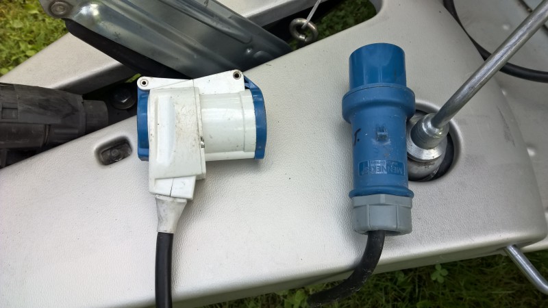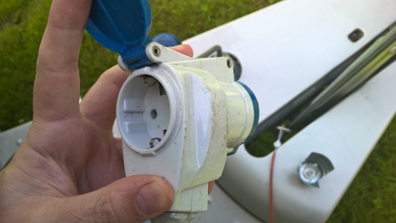Toi adapteri on helppo ratkaisu tuohon sähköpisteeseen. Lomalla tuo johto tuli vedettyä vaunusta keittiön ikkunan kautta mutta jollei halunnut jättää ikkunaa raolleen piti johto ottaa pois aina vaunulta lähtiessä.