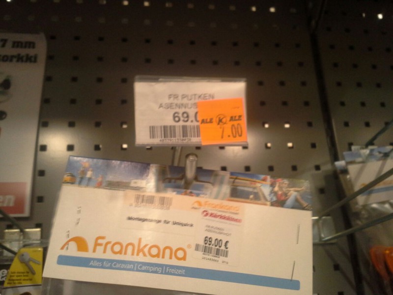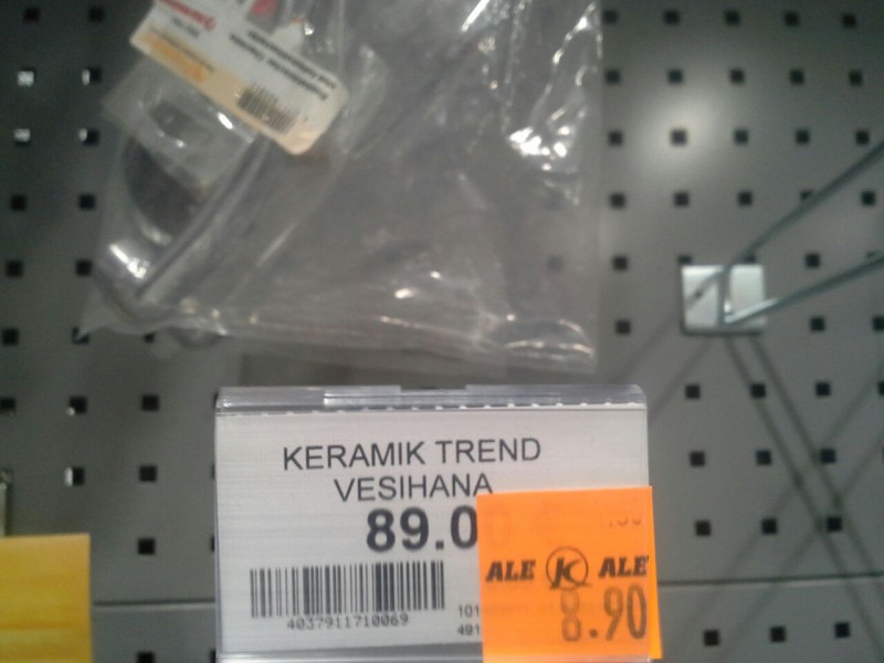 Kerroin käyneeni pari viikkoa sitten, kun oli -70%. Mitään sopivaa ei löytynyt, kun etsiskelin vain tarpeeseen. Varmuuden vuoksi ei viittinyt ostaa, vessan magneettiventtiilin olisin, mutta oli normaalihinnalla. Samoin oli halvalla Italian/Espanjan varoituskyltti pyörätelineeseen tai muuhun ylittävään kuormaan. Mutta sellainen on jo.