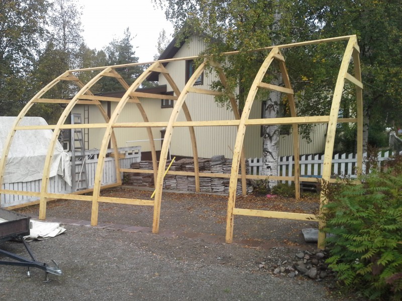 Ihan on itte tehty. Ei mitään sen ihmeellisempiä ohjeita. SketchUp:lla vain piirtelin sopivat kaaret, ohjurikapulat paikoilleen ja ruuvaamaan. Pressu on paikallaan leikattu niin siksi istuu hyvin  :) se on vanhaa romahtanutta kuplahallia, eli paksuutta riittää. Kiinnitin pressun suoraan kaariin peltikattoruuveilla .