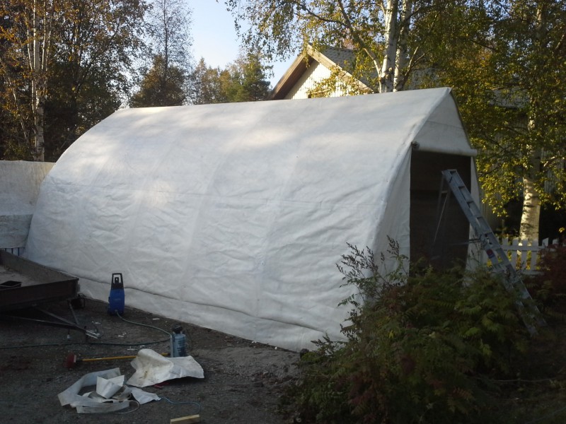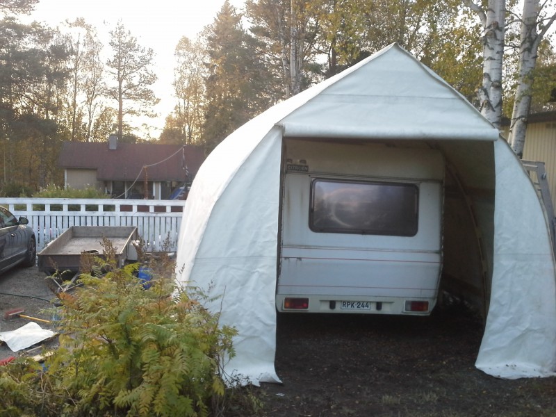 En ole suinkaan vielä luovuttanut vaikkei ole mitään kuulunutkaan. Piti vain alkaa rakentaa sää suojaa sitikalle kun seuraavaksi pitäisi alkaa katto purkamaan pois. Pitkän aikaan pohdin millaisen tekisin vai ostaisiko jonkun halvan hyvän. Mutta melko kalliita näytti kaikki muut vaihtoehdot olevan paitsi tämä minkä löysin joltain venefoorumilta. Eikä ollut mikään mahdottoman iso töinenkään. Aikaa meni vain kohtuuttoman kauan kun olin välissä kipeänä ja töiden puolesta ei ole joutanut. Mutta tänään sain auton vihdoin ajettua sisään. Vähän siinä vielä fiksaamista on, mutta kyllä se jo sateelta suojaa.