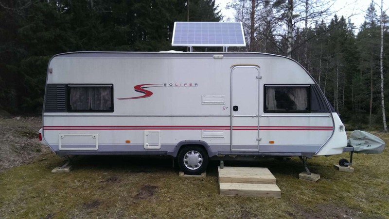 No toi mun,huom se on portinvartijan mökki,ei asuntovaunu,elikkäs kiinteä rakennus jossa valaistus,tv ja tietotekniikka hoidetaan auringon voimalla,tosin soveltuu vallan mainiosti myös vaunuhommeleihin samoilla specseillä,ainoastaan akkujen paino voi tuoda vaikeulksia.