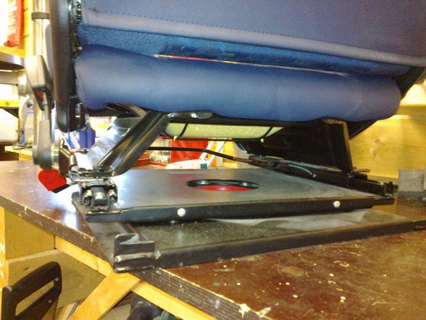 Muistelisin että liukukiskot tuli tuohon päälle. Alustassa etupään kiinnitys oli vähän viisto, joten ihan täysin ei penkki istunut tuohon, mutta ajoi asiansa. Jouduin tuohon akkukoteloon minkä päälle istuin oli kiinnitetty, poraamaan pari kiinnitysreikää tuon alustan etupuolen kiinnitykselle. Ostin sitten neljä pulttia ja mutterit, millä kiinnitykset tuli. Osa penkin omilla ruuveilla.