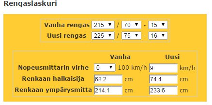 Rengaskooksi tulisi 225-75-16" ja halkaisja kasvaisi vajaa 3cm per puoli. Aika paljon siis, sormituntumalla vaikuttaisi kuitenkin sopivan.