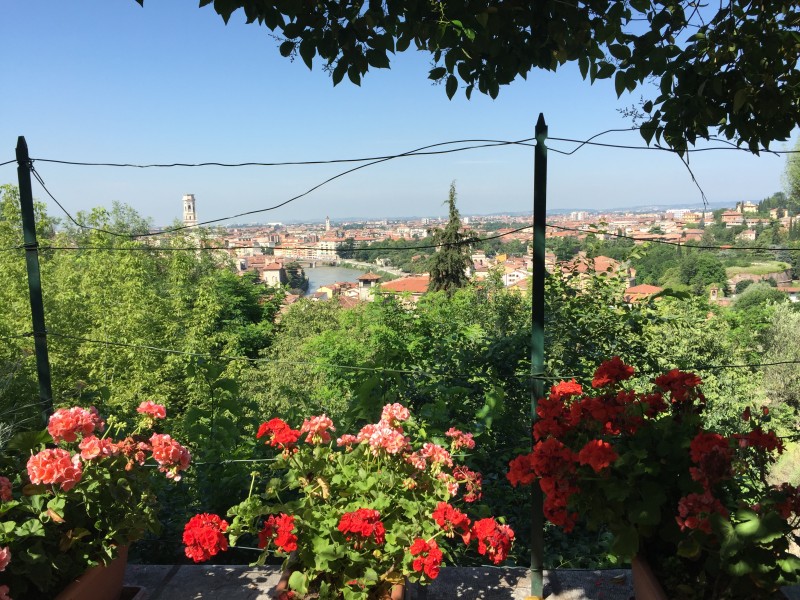 Verona. Täällä on vielä alue ihan keskustan kupeessa. Linnuntietä 300 metriä vanhaan kaupunkiin, mutta kävelytietä suunnilleen tuplat, josta puolet portaita. Erinomainen sijainti silti, ja osaavat sillä rahastaa. Perhehinta 55 euroa vrk, pienet pilttuut, mutta kodinomaiset suihkut ja vessat, ilmainen netti, halpa pesukone ja kohtalaiset baaripalvelut. Vaunumiehen kannattaa kysyä etukäteen, sopiiko sisään, on tuossa yksi lyhyehkö Hymer Nova. Yli seitsenmetrisen auton tai vaunun kanssa voi olla tiukkaa. Porttikin on melko ahdas. Camping Castel san Pietro paikan nimi. Korkeuseroa on, mutta vain telttailijoille. Kuva respan edestä.  Näköala alaterassilta.
