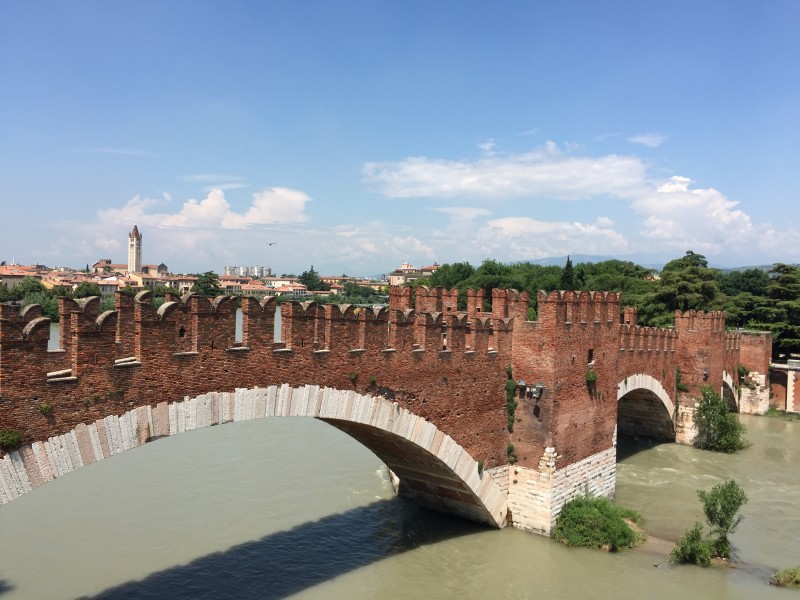 Verona on toki niin hieno kuin kuvitella saattoi. Peruskohteet tutkittiin, Castelvecchio ensimmäisenä. Taidemuseo, jossa painotus 1200-1400 lukujen kuvataiteelle, mitä harvemmin vastaavassa laajuudessa näkee. Toki pääosin uskonnollista sisältöä, mutta löytyi siinäkin tutkittavaa. Linna ja näköalat, varsinkin sillalle, vasta mainioita olivatkin.  Pois keskustasta lähtiessä, juuri ennen siltaa, huomattiin alimentari -kyltti. Mentiin sisään, jossa pitkä tiski täynnä lihoja, juustoja ja pikkusyötäviä. Leipää ja viiniä. Kyltti, jossa seisoi piknik takaterassilla. Eli syötävät tiskistä, ehkä hiukan normikauppaa kalliimmalla, ja terassille suoraan joen rantaan syömään. Talo tarjosi kertakäyttöruokailu välineet. Ei huono. Pari palaa parempaa paikallista juustoa (nuorta ja ikivanhaa), 120 grammaa Parman kinkkua, leipää, pieni punaviini ja vesi 16 euroa. Ihan parasta.