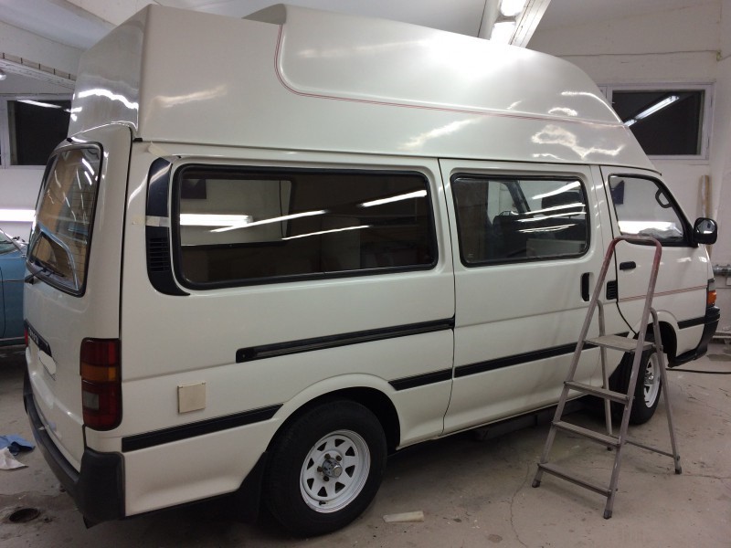 Kiitos kiitos! Maalauksiahan on tehty melkein koko auton osalta. Ja vuosien varrella tätä on toki maalailtu aiemminkin. Ylimaalausta ei nyt kuitenkaan lähdetty tekemään. Ongelmakohtana näissä tuntuu olevan nuo matkustamon ikkunat, joiden karmit ei tahdo kestää, syynä ilmeisesti huonosti tehdyt aukot, painavat lämpölasit, ja vesivuodot yläpuolelta katon ja korin saumasta sekä kattoluukusta. Tässäkin niitä on korjailtu useampaankin otteeseen. Nyt pyrittiin tekemään ne niin hyvin kuin mahdollista ja paikkaamaan vesivuodot jotta ei ihan heti ruostu uudestaan. Sisäkuvia en muistanut ottaa ja auto on nyt jo talviteloilla, pitää postata niitä jossain vaiheessa. Sisällä on siis kuitenkin täysi matkailuauton sisustus (noissa työkuvissa kaikki irtain on tietty otettu suojaan), eli istuinryhmä pöydällä jonka saa makuutilaksi, laskettava ylävuode, jääkaappi, liesi, vedet, truman lämppäri, wc-komero jne. Osia löytyy Tojotaan vielä ihan mukavasti. Varaosia saa tilaamalla ja myös tarvikeosaa löytyy. Sisustus on Mobituotteen tekemä, alkuperäisiä materiaaleja ja 90-luvun sävyjä on aika vaikea löytää, mutta niitä sekä tekniikkaa on uusittu soveltaen, kokonaisuus näyttää silti vielä aika hyvin ysäriltä.
