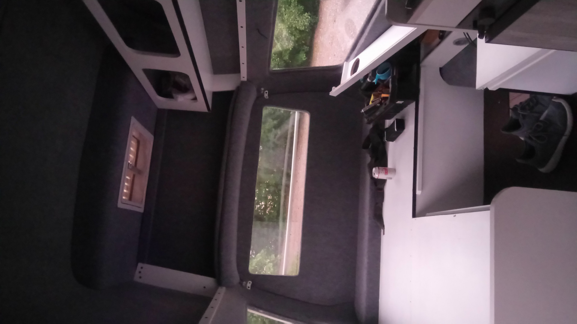 Keväällä 2018 ajoin auton kotiin sisustusta varten. Kalusteet on maalattuna valkoisiksi ja kaikki listat ja saranat hankittuna. Sohvanpäälliset verhoilutin sukulaisella. Kulutin kesälomastani kaksi viikkoa sisustaa tehdessä. Suurin osa ajasta meni sähköihin, mitkä laitoin kokonaan uusiksi. Viimeisin päivitys autoon oli kaukosäätöinen keskuslukitus.