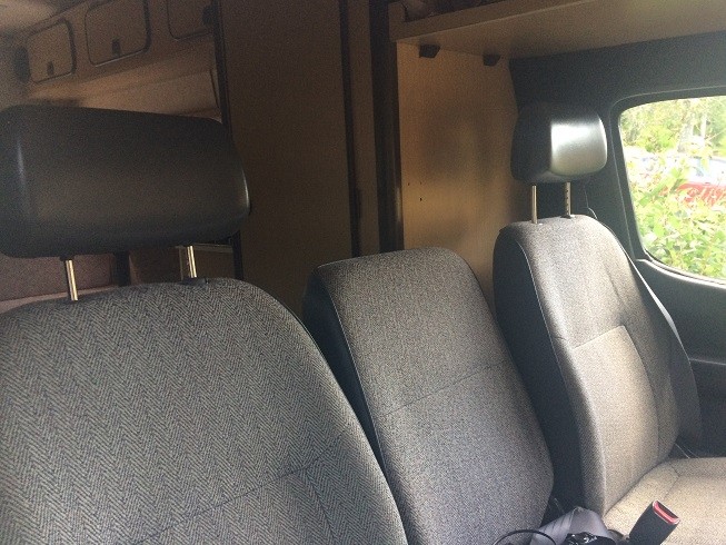 Näkymä matkustamosta eteen. Keskipenkki kääntyy ja korkeutta piisaa joten tuosta pääsee hyvin kulkemaan