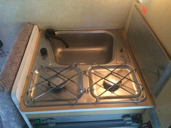 Keittiönurkkaus. Pöydän kannen alta löytyy hella ja lavuaari. Hellan toinen nuppi on hukassa