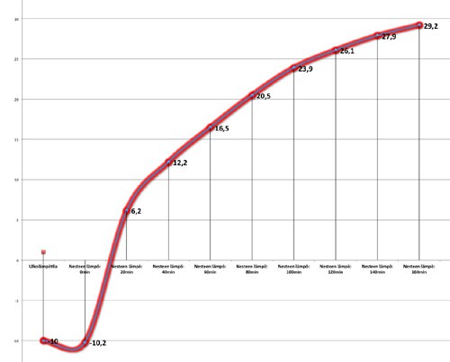 Käytännössä starttilämpöistä 20min jälkeen, eli ollaan ns. 'kesälukemissa' nesteiden kanssa.
