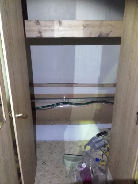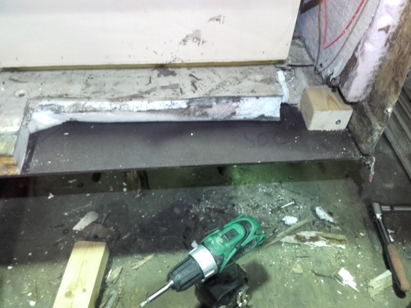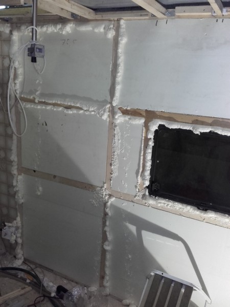 Niin se kyllä on, joku luukku on oltava auki. Ilmastoinnille jää vielä paikka kaappiin pannun viereen. Laitan sen kesällä, jos tarvetta. Nyt on purettu seinää. Märkää oli vessan kattoluukun kohdalle asti. Yläpuu vaihdettiin vähän pidemmällekin. Nurkkasaumasta on vuotanut. Vessan kattoon täytyy vaihtaa puut ja tiivistää kattoluukkukin uudestaan samalla. Lattiaa menee vaihtoon samanlainen pala kuin toisellakin puolella.