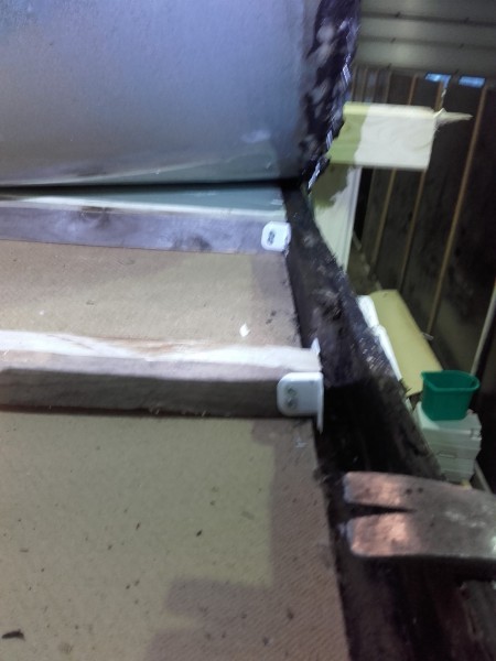 Tuommosella bitumi teipillä oli edellinen asentaja tiivistäny  Katto takaa oikealta.  Tuon verran on uutta tehty  Lattia takaa vasemmalta. Mikähän tarkoitus nuilla vaneri soiroilla on ulkopellin ja runkopuun välissä? Oli aika työläät irroittaa, kun nekin piti vaihtaa.