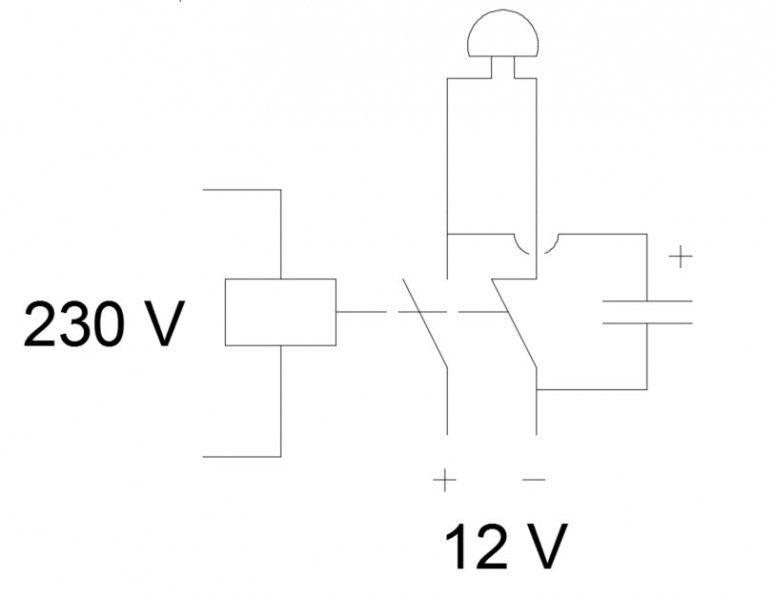 ![]() Onko sulla jokin 12V laite, joka syö niin paljon tai herkkä (sekoaa), että verkkosähkökatkosta haluat ilmon? Voihan onkelmaan olla jokin muu ratkaisukin.. Periaatteessa 230VAC rele (1 NO, 1 NC), 12V summeri ja rinnalle isompi elko konkka, jolla inisee hetken kun konkka tyhjä .. esim. näin. ![]() Edit: tokihan tuon konkan voi korvata 12V akulla, jos ääni pidempään on tarvis.. Harrastustuominnan takia yövyn sellaisessa paikassa jossa aina välillä joku irrottaa liityntäkaapelin seinästä, kun ei tiedä minne roikka menee. Ja toisessa paikassa automaattisulake palaa aina välillä.