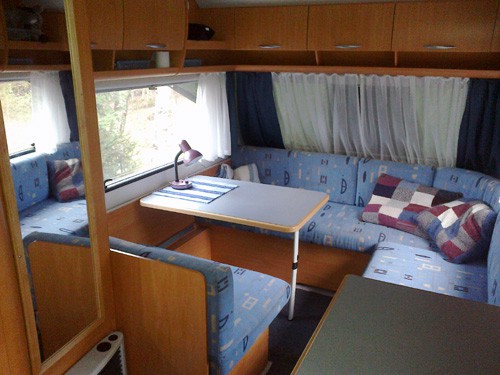 haalean siniset verhoilut vaihtui aika tumman harmaaseen ja lattiaan tuli lattia vinyyli joka myös tosi tumma, mutta on hyvää tavaraa esim. asuntoautoon koska 100% veden kestävä ja vain 4mm paksua ja asennus helppoa se on niinku laminaatti, hinta aika kova 40e neliö mutta eihän tuommoseen autoon paljon mene. laitan kuvia ku saan kaiken täysin valmiiksi.