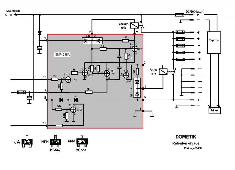 Kysyjä sanoi, että valot toimi reissussa, näin varmaan olikin kunnes akku oli niin tyhjä, ettei mikään toiminut enään. Jos reissussa on oltu verkkovirrassa ja kaikki on toiminut, mutta kun verkkovirta on irti ei mikään toimi, joko DC/DC-laturi ei lataa tai Dometik muuntajan releen kosketin palanut verkkoasentoon kiinni ja ei palaudu lepoasentoon. Onko Dometikin muuntaja kuvan mukainen. Jos saisi valokuvan niin ei tarvitsisi heitellä vääriä kuvia näkyviin.