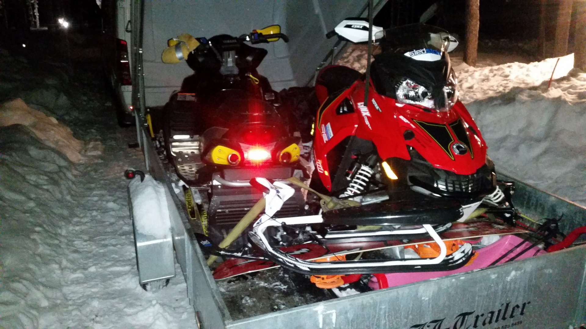 (Kuva piiloitettu, klikkaa tätä niin näet kuvan.) Hyvin on kulkenut 4 talvea lapinreissut tuolla kärryllä. Jj trailer 3700xl ja jaxalin kuomu. Hitsaamalla tehty runko ja koukkupainoksi kun laittaa noin 70kg niin kantavuus riittää just kahdelle kelkalle. Tankki pitää vain ajaa tyhjäksi ennen lähtöä (niin hyvää bensaa täällä ei ole että sitä kannattaisi 700km kuskata mukanaan lappiin)