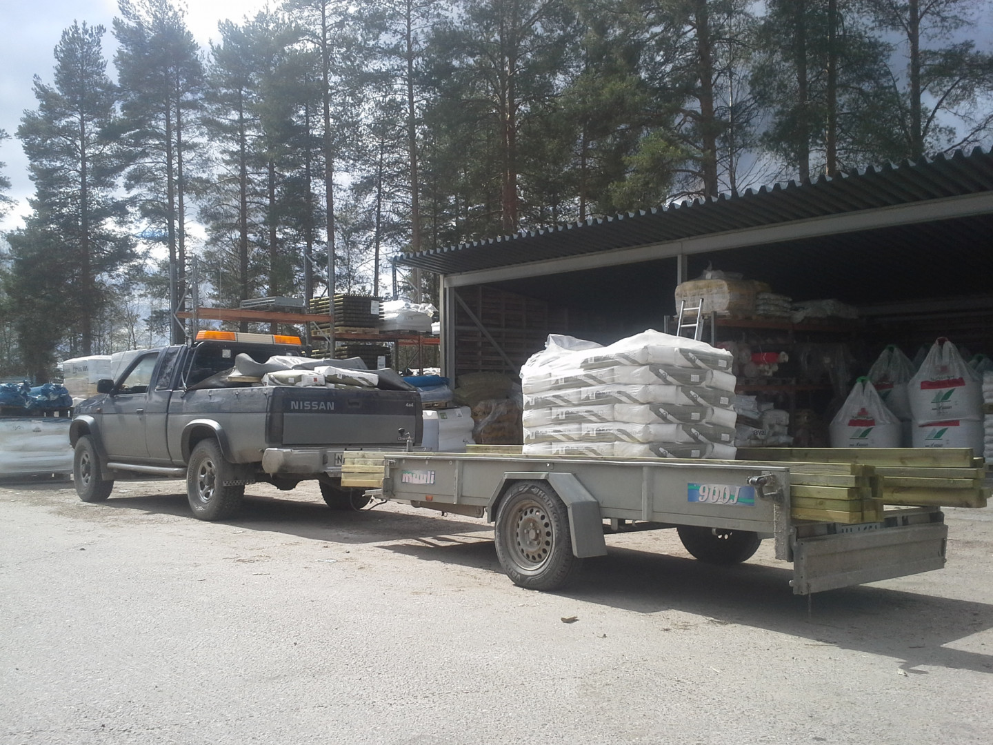 Niinno, mulla on jarrukärry koska en tajua mitä tekee jollain 500kilon kärryllä   Maksimi yksiakselisen jarrukärryn kuorma, 1250kg.. Tai no ehkä vähän yli ku nuo painekyllästetyt oli litimärkiä  Lavalla oli noin 500 kiloa samaa sementtiä, ei voi oikein sanoa että lavadasse olisi ollut kovin hyökkäilevää sorttia..
