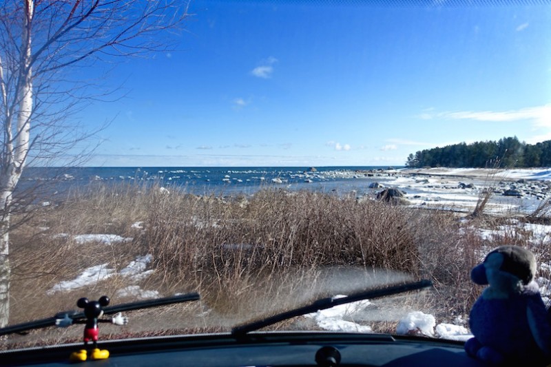 Kuvissa näkymä auton tuulilasista, alue ja ranatakuvassa tämä p-paikka on siellä tornin takana. Asumatonta luonnontilaista suojelurantaa jatkuu kilometritolkulla, kävellä voi Altjan kylään asti.