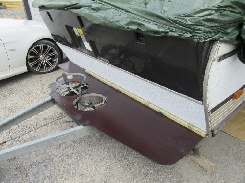 Sitten sain pannun paikoilleen ja lämpöputkien läpiviennin kera butyylimassan. Sisäpuolelta täytin putkien ympärystät uretaanilla ettei höngi välistä kylmää. Tosin tämäkin oli turhaa koska vaunu tulee meillä vain kesäkäyttöön tällätietoa.