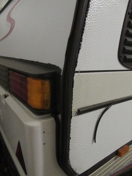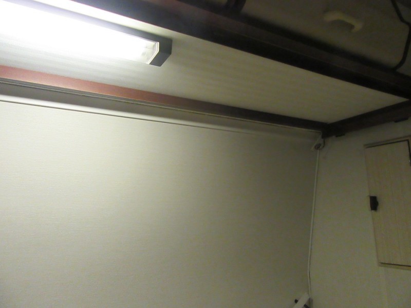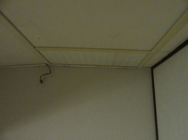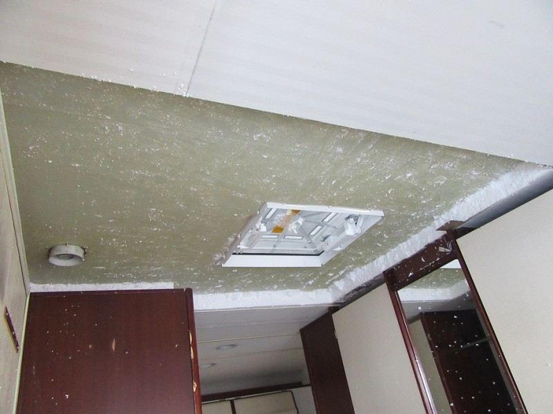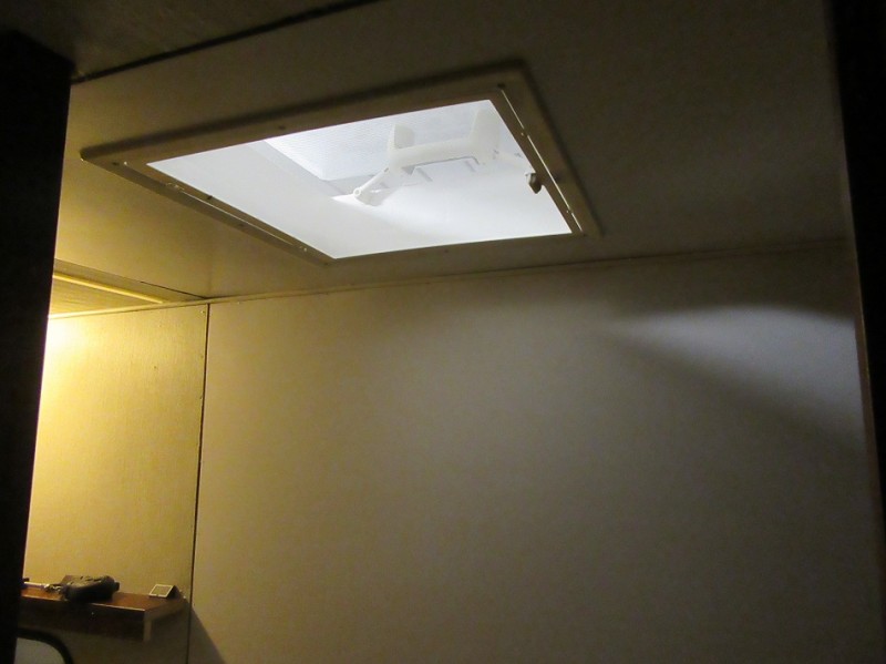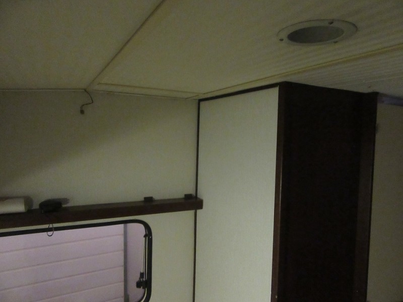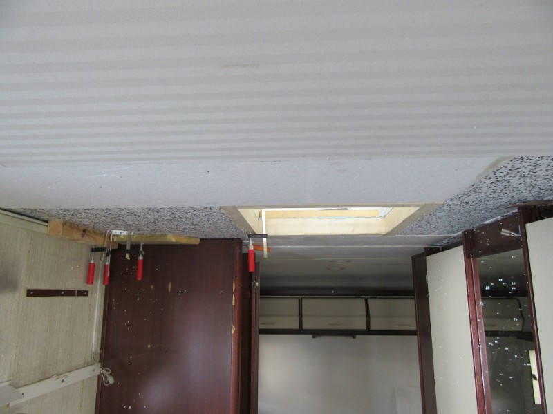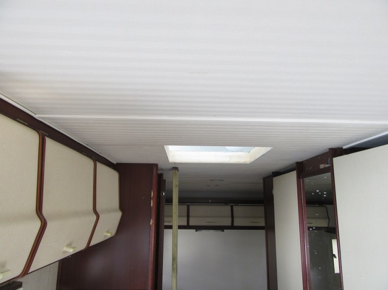 Takatilan kattoon uhrasin pienen palan tuota raidallista levyä. Koko vaunun levyistä kaistaletta en alkanut vaihtamaan kun oli huono vain tuosta reunasta kun vesi päässyt katon ja seinän saumasta tuohon reunaan. Poikittain keulasta jäänyt pätkä tuota samaa listaa kun siellä alunperinkin on. Kattovalo lähti tuostakohtaa samalla ja tilalle tuohon virtajohtoon tulee led taulu tv niin sen päälle en ajatellut lamppua enää laittaakkaan