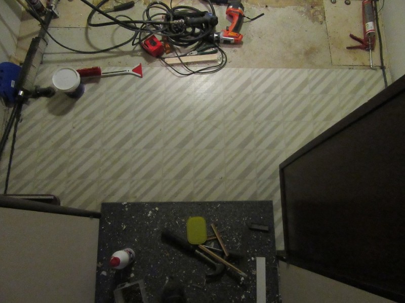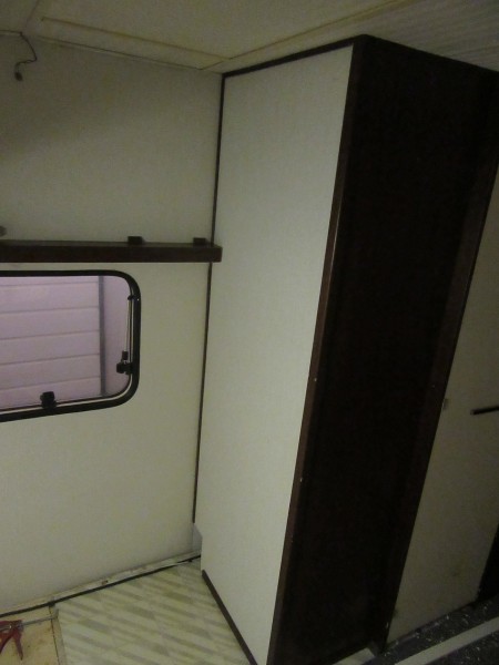 Vessan seinän parissa mennyt eilinen ja tämä ilta, kovin montaa tuntia ei ollut nyt aikaa panostaa tuohon. Mutta kohtalaisen siisti siitä kuitenkin tuli. Ensin havainnollistava kuva miten paljon vessa laajeni vaunun takaosaan ja sivusuuntaankin n. 4cm(kasetti oli n. 68cm ja koppi tuostakohdin ennen 64cm). Kuvassa siis vasemmalla kuivauskaappi niin sen peräseinä ja vessan peräseinä on alunperin olleet samalla tasolla.