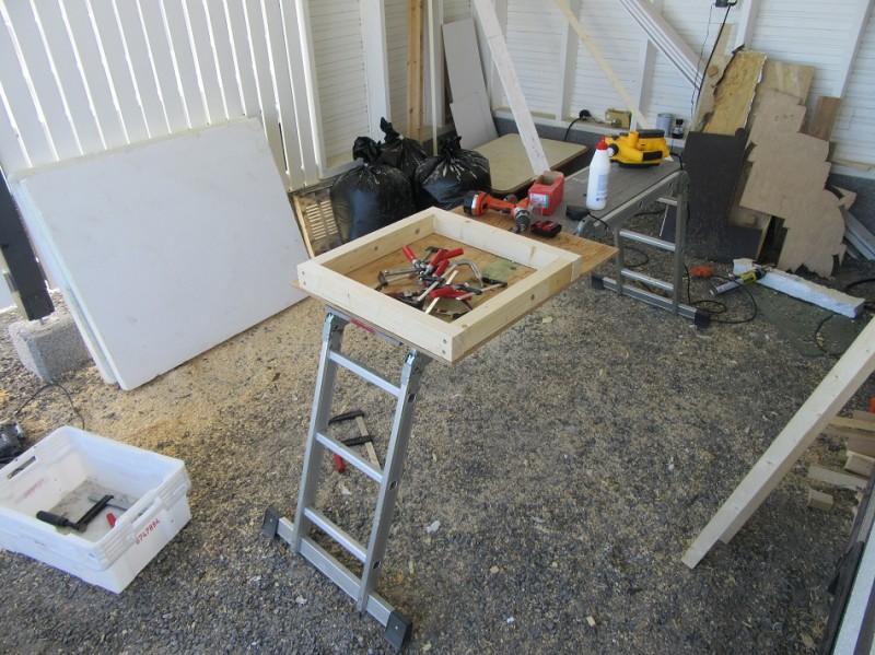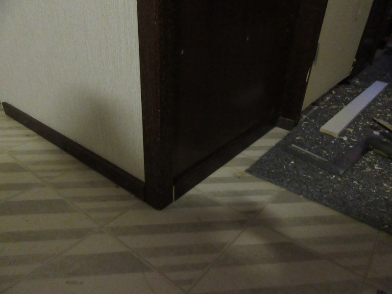 Alapäässä levyjen kiinnitys parilla ruuvilla kasetin alle tehtyyn 11cm korkeaan korokerenkaaseen ja päälle peitteeksi höyläsin hieman ohuemmaksi tuossa kuivauskaapin seinässä olleita hyllynkiskoja niin niistä tuli oivat jalkalistat kun vähän laitto päitä oikeaan kulmaan sahalla ja naulaimella nappasin ne kiinni