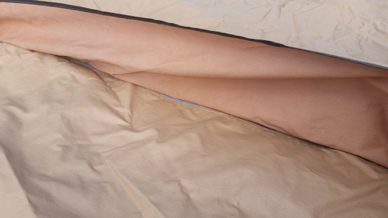 Tuossa keskellä kattoa on vetoketjusauma. samoin ikkunalliset etuseinät on vetoketjulla kiinni. puuttuuko tuosta tuo keulanpuoleinen seinä vai liekö ollut lisävaruste? Kunto minusta kuin uusi, ei repeämiä ja ikkunat ehjät eikä ole auringon haalistama.