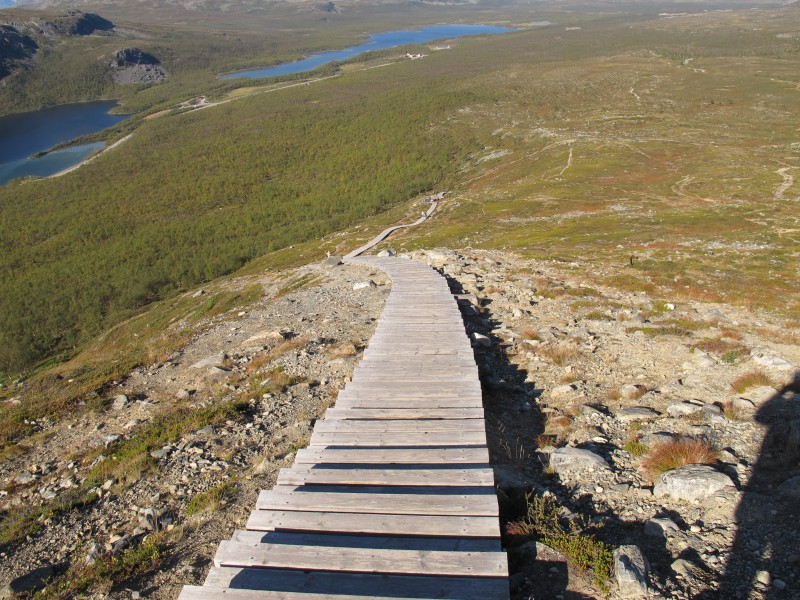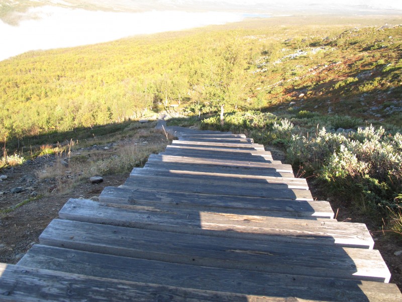 Eikös se ole 4 kilometriä. 1 kilometri pitkospuita koivikossa, sitten 700(?) porrasta ja sitten loppu rutistus kivikkoa/polkua ja aina huipun jälkeen uusi huippu edessä. Mutta kyllä se loppu sieltä joskus tulee. Ja takas.