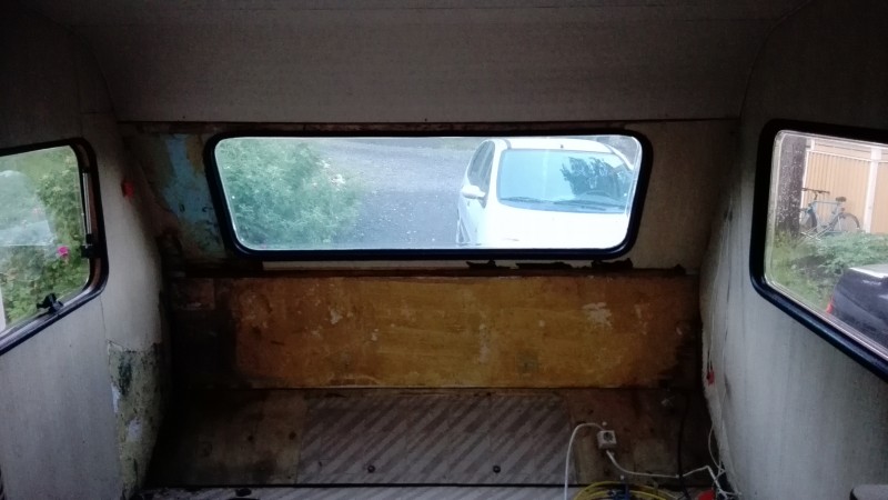 Tänään purettu etuosan kaapistot. Koko etuikkunan alaosa aivan märkä. Vasempaan etukulmaan on joku tehnyt aikoinaan remonttia joka ei ole ilmeisesti ihan onnistunut  :o