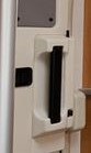 Kuskin ovesta en edes löytänyt sisäpuolelta mitään namiskaa mistä sitä voisi laitella lukkoon. Tyhjä reikä löytyy, missä voisin olettaa joskus olleen jonkinlaisen painonapin. Samoin tämä lukko toimii avaimella ulkopuolelta moitteetta.