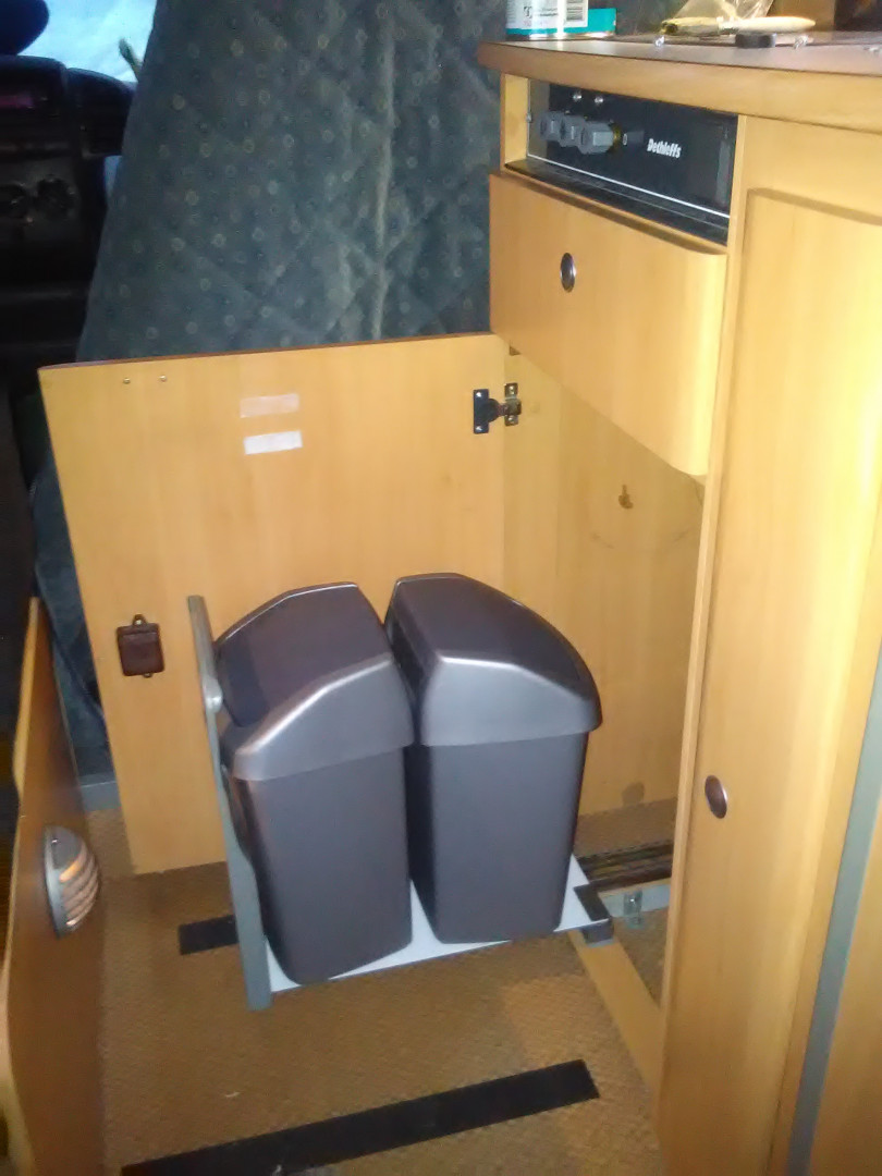 Roskiksen viereen välilevyä hyllyllä. Muovisten kaapin ovien hyöty käyttöä. Lisäksi kannakkeina muovikulma listaa. Kuvat kertovat loput.