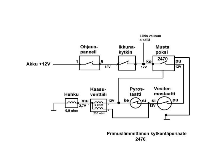Sent from my iPhone using Tapatalk Morjensta vaan! Ensimmäinen vaunu hankittu muutama viikko sitten ja primuksen (2470) kanssa heti ongelmia. Eli ei syty nyt ollenkaan pannu pöhisemään. Mittailin eilen jännitteitä ja huomasin että hehkutulpalle tulevaan johtoon johdon ollessa irti hehkusta tulee n.5v (muistaakseni). Johdon kun laitan kiinni tulppaan ei jännitettä ole juuri nimeksikään kun pannua yrittää käynnistää. Onko nyt niin että hehku on rikki vai onko maadotuksessa ongelmia? Puhdistin hehkun kierteet pannusta, oli pientä ruostetta. Hehku itsessään näyttää päällisinpuolin ehjälle ja puhtaalle. Vesipumppu tuntuu pyörivän, ikkunan kytkin tarkastettu, akussa jännitettä, ohjauspaneelin takaa mitattu 1 ja 8 pinnin välinen jännite -> ok, kaasua on. Voisiko joku viisaampi avittaa? Kiitoksia!