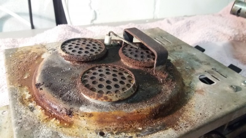 Pohjan kaasuputkisto irti ja mokkuloiden päästä kierretään suuttimet ieri ja puhdistetään kuparisäikeellä. Jos suuttimen sisällä on verkko niin se poistetaan neulalla.