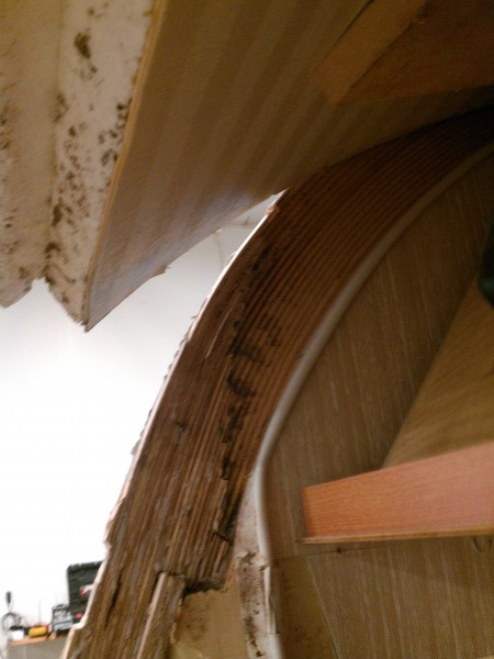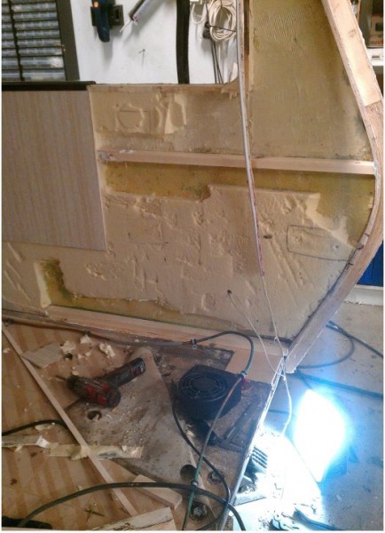 Kaaret pitää tehdä taivuttamalla tuohon keulaan. Kuten mjo tuossa totesi tai sitten samalla tyylillä kun itse tein eli teet jigin ja taivutat kaaret siinä. Jos vaneerin leikkaa vain kuviosahalla oikeaan muotoon niin silloin nurkkalistan kiinnitys ruuvit menee vaneerin 'päästäpäin "sisään ja halkeaa varmaankin aika helposti kun noita ruuveja on noin 10-15cm välein. Ei eristeitä tarvi kyllä aiva äkkiä vaihtaa paitsi toi seinän alaosa on styroxia.  Muuten eristeet on kattoa lukuunottamatta uretaania ja riittää kun poistaa senverran että saa puut poistettua.