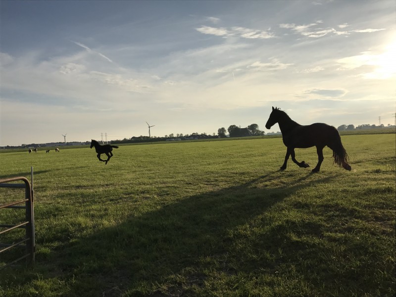 Boerencamping Half Hichtum. Bolsward, ei pitkä matka Ijsselmeerin padolle. Nyt kattelen heppoja, jotka on 5 metriä auton keulasta.