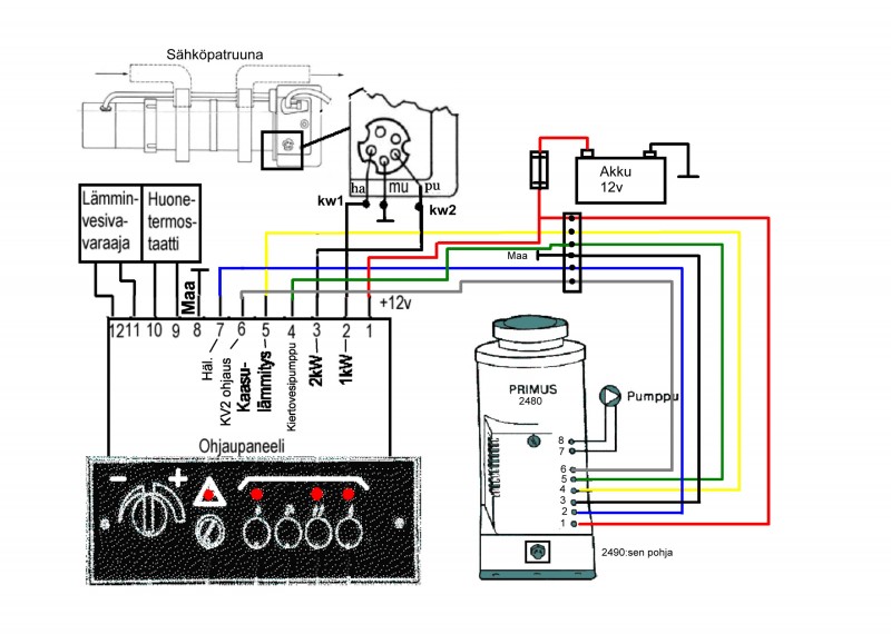 Kiitos pikavastauksesta. Kaipaisin tarkennusta, et mikähän poksissa olisi vikana? Eilen otin akun kengän irti, ajattelin sen nollaavan järjestelmää ja niin taisi käydäkin koska tänään pannu taas pohisi kaasun hajun tunkiessa tajuntaan, mutta sytys ei toimi (tuikkasin tulen pannun hatun väliin, sit tulikin kiire sammuttamaan ettei paisuntasäiliö sula  Pumppukin ilmeisesti pyörii, koetin kädellä niin tuntui pieni värinä vaikka en kuullutkaan mitään ääntä karvahattu korvilla  Kurkistin sen mustan laatikon alle, siellähän oli johto poikineen, liittimet oli kiinni, suhautin jotain hapettumien irrotus spraytä. No sit irroitin kirkkaan johdon pannusta (oisko liekin tunnistin) ja painoin resetistä, pöhinää kuului muttei syttynyt... mikähän se sytytin on ja pitäiskö tässä mallissa kuulua sytytys kipinän ääni vai mikä on sytytystapa 2480T? Mistähän navoista patruunan (katsoin, siinä ei ole vesipumppua) mittaus tapahtuu? Pitääköhän tollanen patruuna mitään ääntä, kun ei ole sitä pumppua? Nyt mietin josko olisi vaikka kunnossa, kun koetin eilen vain sen verran et kuuluuko mitään pörinää ja kun ei kuulunut niin ajattelin sen olevan eloton  - Repe