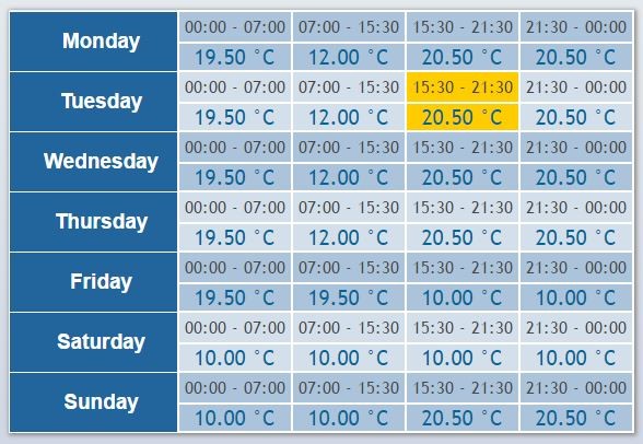 Tällä hetkellä perusviikolle on määritelty alla näkyvät lämpötila-alueet siten, että kun aikaikkunan tavoitelämpö saavutetaan, lämmitys loppuu ja kytkeytyy 0.9 astetta alempana takaisin päälle.