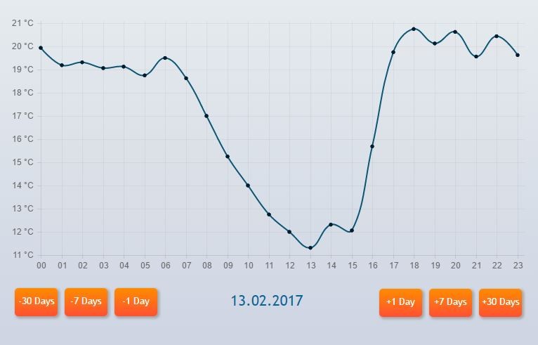 Käytännössä siis päiväsaikaan annetaan lämmön tipahtaa kun ei vaunussa oleile kukaan ja ilta-ajaksi nostetaan lämpö mukavalle tasolle. Illalla sitten nukkumaan mennessä tiputetaan lämpöä asteen verran alemmas, ihminenhän nukkuu paremmin vähän viileässä :) Se, miltä käytäntö näyttää, näkyy alla olevasta kuvasta (statistiikka mitattu eilen föhn-tuulten vallitessa, eli ulkona muutama plusaste lämmintä)