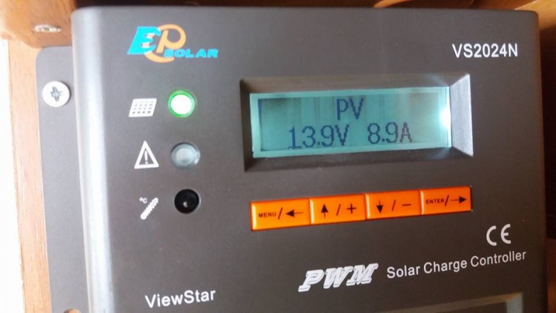 Kulutusmittarista otettu kuva (ylempi kuva) on illalta ja lataussäätimesä otettu kuva (alemi kuva) päivällä auringon paisteessa.