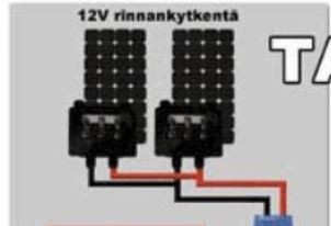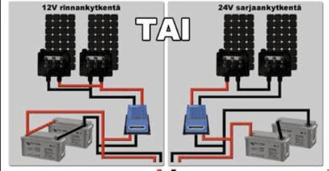 Sarjaankytkentä(oikea kuva) on akkujen osalta 24V:n järjestelmästä. Siis raskaamman kaluston käyttöön. Paneelikytkentä MPPT-säätimen kanssa käy.