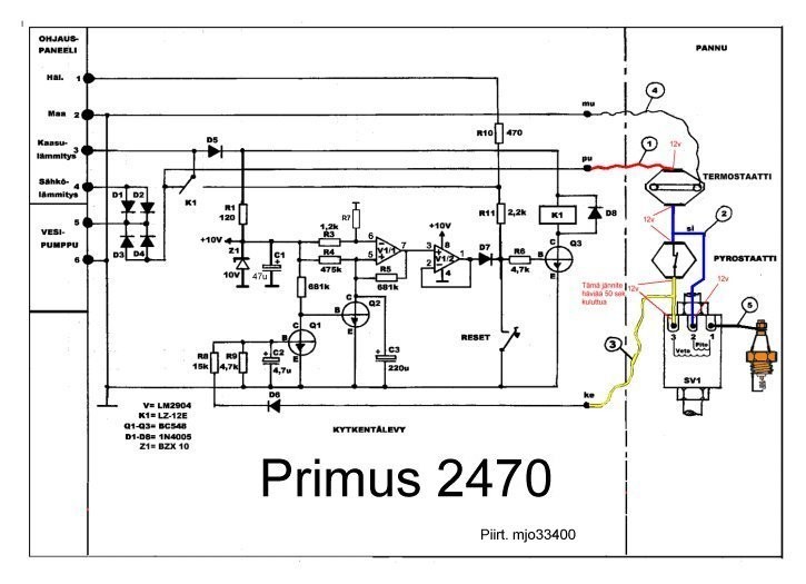 Onko tarkistettu, että uusi pumppu saa mustasta poksista jännitteen, ettei vanha pumppu ole polttanut sieltä diodeita. Kytkentäkuva mustan poksin piirikortista, jos lämmitin on Primus 2470.