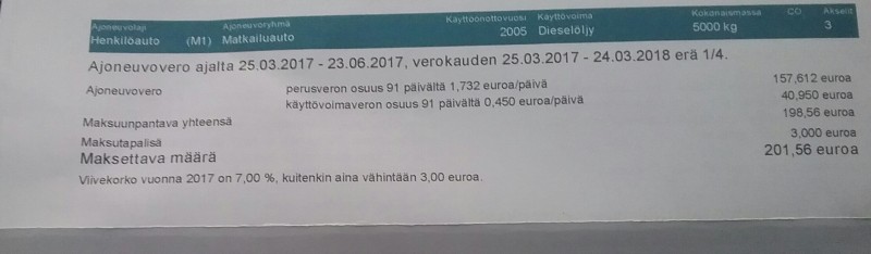 Henkilöautoista en muista mutta asuntoautosta tuli eilen lasku, ni näkkyy lukevan, että perusveron osuus 1,732e/päivä ja käyttövoimaveron osuus 0,45e/päivä eli yht. Rapeat 2,182e/ päivä Ja vakuutuksista lisää. Missähän tuo trafin minimimaksu 10€ näkyy? Muistaakseni mulle on aina tullut lasku, jossa on vuosi eteenpäin vähennettynä jo siltä ajalta maksetuilla maksuilla.Siellä laskulla seisoo, että "Veroa maksuunpannaan vähintään 10 euroa" - takapuolella seisoo. Jos kokeilet katkaista 3. päivästä, niin etkö hän kympin laskuu saa.. Liikennekäytöstä tulee lasku (ikäänkuin liikennekäyttö jatkuisi hamaan tappiinsa, toki sen eräisenä kun olet sopinut) ja uusilasku lähtee lähtee kun otat pois liikenteestä, eikö? Jokainen liikennekäytöjakso aloittaa uuden verokauden. Ei auta onko sisässä palautuksia, veloitus on kymppi minimissää.. Minä en vois seisottaa Citigoa päivääkään