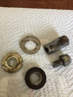 Viitonen jäi päälle kun vaihdekepin alapään pultti oli katkennut ja siitä systeemistä tuo holkki oli pudonnut murroksen ja kopan väliin aiheuttaen sitten koppaan reiän. Nuo kuvassa olevat osat jäivät moottorin alasuojuksen päälle. Holkki oli murroksen ja kopan välissä jumissa. Mikä pultin oli katkaissut se ei selvinnyt meille. Se oli puoleen väliin aivan kuin sahattu ja lopulta katkennut? Pitempi osa pultista oli hävinnyt.
