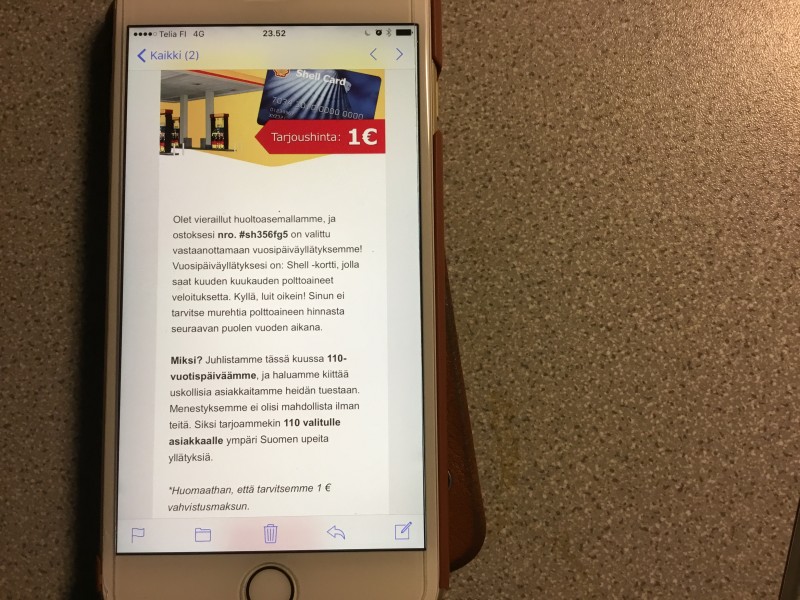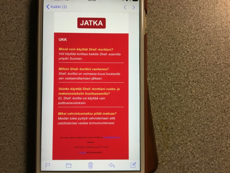 Shellin nimissä liikkuu tuollaisia viestiä. Tuli nyt illalla sähköpostiin. En kylläkään mennyt lankaan, vaikkakin tänään aamulla Shellillä tankkasin. Tein ilmoituksen myös Shellin palvelumestari numeroon.