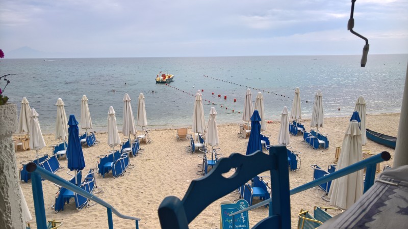 Aamusella lähdettiin tienpäälle, ei kauas päästy kun tuli ranta vastaan ja paatti odotteli kita auki. Puolituntia jyskyteltiin ja saavuttiin Thassoksen saareen. 40 kilometriä ja tukikohdaksi osui camping Pefkari . http://www.camping-pefkari.gr/ Täältä ei poistuta kuin fillarilla ja veturilla, tosin skoottereita näytti olevan vastaanotossa vuokrattavana. Sikaa pitäisi ostaa kun rosmariinipuska tuossa vasemman takatassun luona  :)