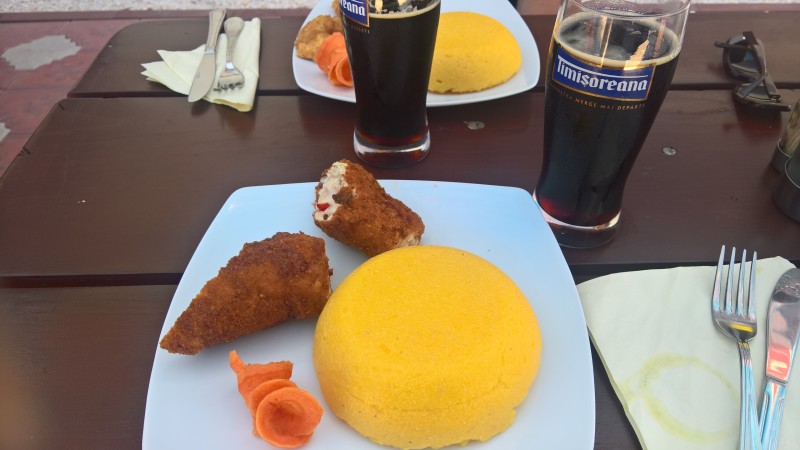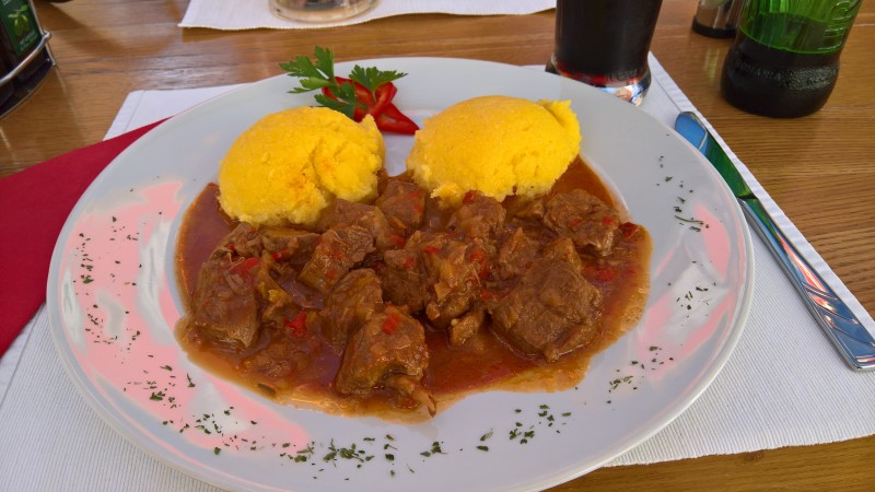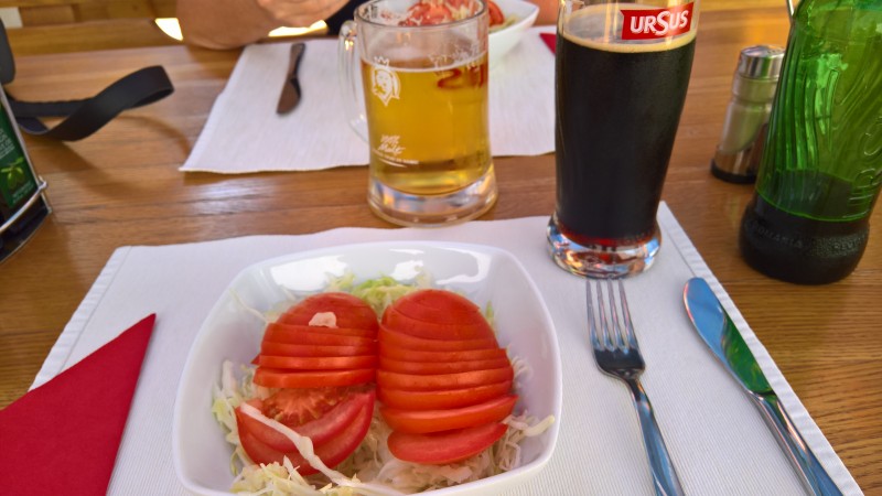 Sitten lähdettiin jatkamaan matkaa , matkalla tuli vastaan majatalo jossa ulkopöydät ja siitä ruokaa eteen. Kievin kanaa , mamaliigaa (polentaa) salaatit molemmille ,isot Ursus Blackit ja espressot viimeiseksi. Lasku kahdelta  n 13€