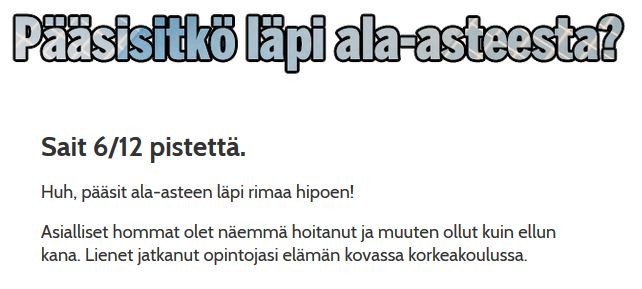 ![]() Minä läpäisin ala-asteen jo n. 60 vuotta sitten, ei tarvi enää kokeilla. Sillon oli kansakoulu. ![]() Minä läpäsin jo aikoinaan. Vaikka en saanu päästötodistusta kansalaiskoulusta, yhteiskoulusta, peruskoulusta enkä lukiosta. Ammattikoulusta sain.